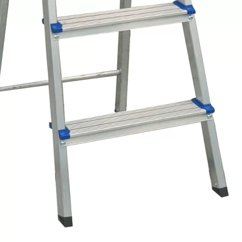 Escada de alumínio de liga especial, super resistente com degraus e sapatas antiderrapantes. Trava de segurança em alumínio com articulação lateral e sistema de sustentação traseira em X.